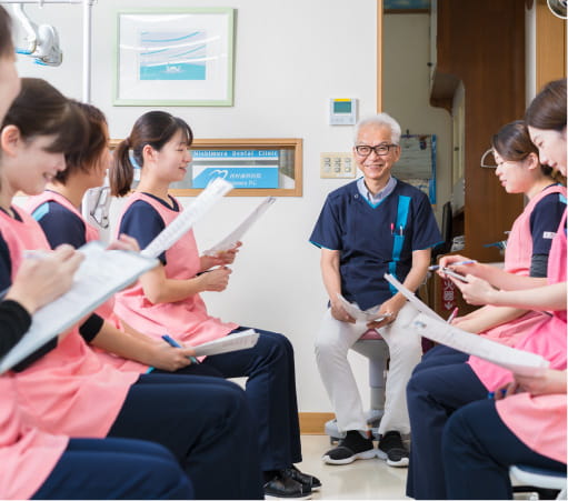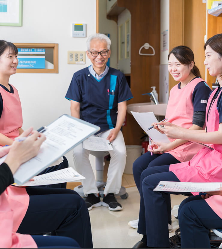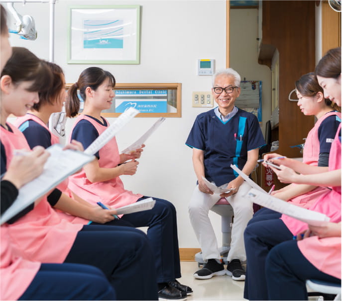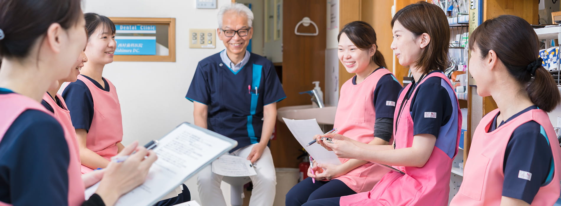 西村歯科医院は、年齢層も幅広く、虫歯治療、歯周病予防、子供の矯正治療と、様々な経験を積むことができる歯医者です。また、研修も充実しており、治療以外の知識も高めていくことができます。福利厚生面も完備され、スタッフが長く勤められるような環境です。